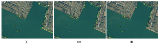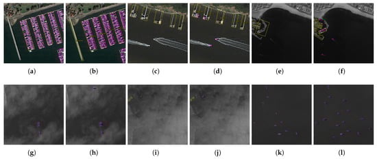 Figure 11 compares the ground truth labels of some validation set images with the detection results of the ReBiDet model trained solely on the training set. The images demonstrate the superior ability of ReBiDet to detect objects not annotated in the original dataset. Figure 11a,b showcase the strong performance of ReBiDet in detecting densely packed vessels, while Figure 11c,d exemplify its recognition capability for vessels in motion. Figure 11e,f,k,l demonstrate the effectiveness of ReBiDet in detecting small objects with indistinct features. Furthermore, Figure 11g–j demonstrate the robust detection performance of ReBiDet, even in complex scenes with cloud and mist interference.