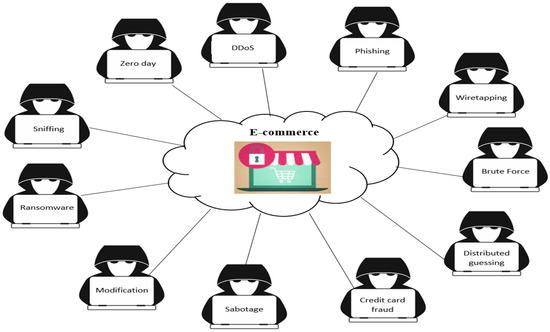 Due to the rise in credit card theft and compromised client accounts, e-commerce security has lately been a major concern. Compromising of customers’ account information and credit card fraud are the two most serious security issues that are known to affect e-commerce [3]. The usage of e-commerce has significantly developed over the past several decades, and as a result, there are now exponentially greater transactions and numbers of payments made on online platforms. E-commerce has sophisticated an explosion of development, leading to security risks that threaten the personal information of users and attempt to detect private, public, and shared keys [4] in encrypting commercial and personal data/information [5]. Bitcoin, Litecoin, Freicoin, and Peercoin are among the currency-encryption approaches utilized in e-commerce applications. Some of these schemes apply cryptography algorithms to provide confidentiality and secrecy features [6]. It is common for e-commerce applications to be attacked (see Figure 1) by the types of common risks such as distributed denial of service (DDoS), phishing, wiretapping, brute force (BF), distributed guessing, financial fraud, sabotage, modification, ransomware, sniffer and zero-day. For instance, by producing a large number of malicious requests, a DDoS will crash the e-commerce applications and make them unusable for customers. Furthermore, e-commerce requests may be collected and modified through wiretapping on the transferred transaction encryption over the Internet. In addition, hackers use phishing attacks to capture the confidential information of customers through the creation of fake websites that are similar to real websites. Moreover, by using all possible combinations of characters, BF will crack passwords. Customers’ private data and payment transactions have become major concerns [7]. Furthermore, financial fraud is committed through the theft of private information from credit cards when e-commerce platforms use this method to purchase services and products. Additionally, it occurs through false requests for credit returns through unauthorized transactions.