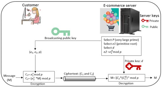 - ElGamal AlgorithmThis is a major asymmetric encryption approach that was invented by Taher El Jamal in 1985. This algorithm depends on Diffie–Hellman key exchange. The algorithm can be an alternative manner for RSA public key encryption [28]. The primary distinction between RSA and ElGamal is that RSA relies on how difficult it is to analyze huge prime numbers, whereas ElGamal’s security depends on how challenging it is to compute the discrete logarithm of large prime numbers. Table 1 shows the comparison between ElGamal and RSA in some characteristics, and ElGamal is characterized by key length, scalability, power consumption, application etc. [29]. Because it depends on the specifics in order to find all potential solutions, the discrete logarithm problem is regarded as one of mathematics’s most challenging. This encryption is almost elusive or very time-consuming [13]. Figure 4 shows the use of ElGamal keys with encryption and decryption. Three procedures—key generation, encryption, and decryption—can be used with the ElGamal algorithm. The following is a brief illustration of each procedure: