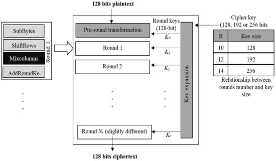 The ElGamal algorithm works to increase security, and it is difficult to break [30]. Although the ElGamal cipher algorithm is a popular public-key cryptography algorithm whose security is based on a difficult discrete logarithm problem, the traditional ElGamal encryption algorithm still has some shortcomings including the long ciphertext and the time-consuming calculation, and the higher the complexity, the slower the encryption speed [31]. - Advanced Encryption StandardBlock cipher technology, known as the “advanced encryption algorithm” (or “AES”), operates on 128 bit plaintext and uses the same key for both encryption and decryption. The 128 bit blocks are performed by the AES algorithm, which performs 10, 12, and 14 rounds of operations on each block. It uses an 80, 128, 192 and 256 bit cipher (see Figure 5 [32]). It is made up of a 4-byte array that identifies the state, and in each cipher round, conversions are made as SubBytes (), ShiftRows (), MixColumns and AddRoundK ().
