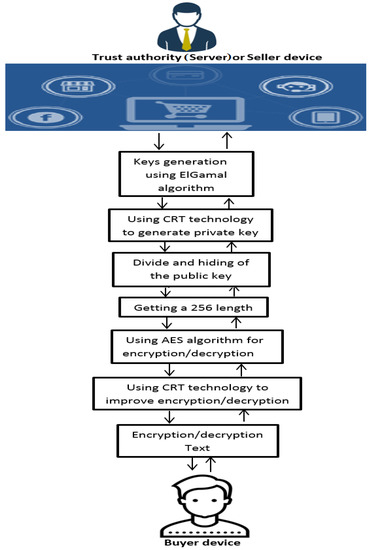 The diagram shows the two types of encryption algorithms we used, symmetric and asymmetric, and we used the CRT technique in the operations of encoding and decoding order information in e-commerce.