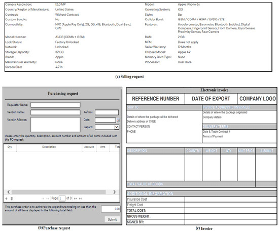 We implement encryption operations based on the AES algorithm for a set of encryption requests, and there are forms of requests that buy and sell requests and invoices. Figure 8 shows types of request forms. The request information is encrypted, whether it is a request to buy or sell or pay bills, based on the request procedure. Requests forms used in this research are real forms for e-commerce applications, which are forms taken from free databases [38] on the Internet and do not contain personal information or network. In order to complete the encryption process and decryption for the purchase requests to sell and invoice properly, we added some personal information and unreal request data for virtual users. We encrypt a request received from the customer or buyer based on the AES method and then sent it to the TAS. Here, information is encrypted and difficult to hack (if the encryption is strong with high key randomness) by legitimate network parties, and personal information is protected for both the client and the server.