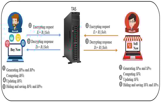 The AES algorithm encrypts/decrypts the buy and sell requests upon delivery from the buyer (B), seller (S) or trust authority server (TAS). However, the use of keys as small as 80 and 128 can compromise the customers’ sensitive information. Therefore, our protocol relies on a key length of 256, which is enough to block attacks. In addition, our protocol addresses a scalability problem that is inherent in symmetric algorithms, whereby all users use the same secret key. Our protocol uses a different secret key for each user by using the public keys of the ElGamal algorithm. In addition to the importance of key length, fundamental reasons that AES can be vulnerable to attacks are the randomness level of keys and cryptographic randomness. Therefore, our protocol uses strong AES ciphers that provide appropriate key length (256 bit), key randomness (ElGamal), and cryptographic randomness through the use of a random salt with fewer performance expenses.