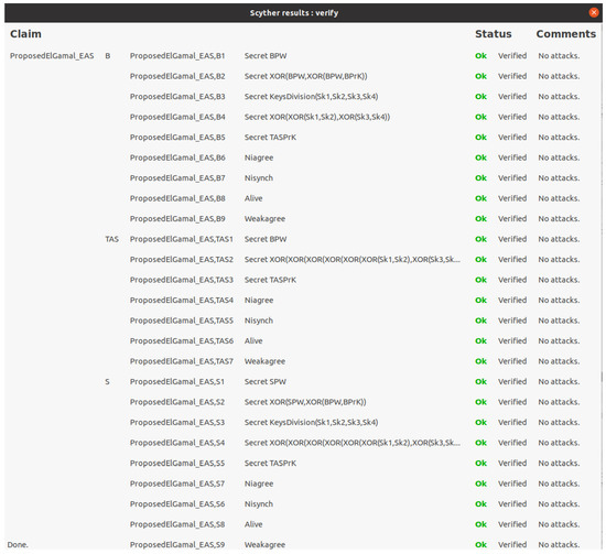 Scyther description with the proposed e-commerce protocol: This tool uses security protocol description language (SPDL) and a set of roles depending on the protocol designed. Each role represents an e-commerce network entity. We wrote a set of commands to configure our network entities, which are buyer (B), seller (S) and trust authority server (). These commands simulate the procedures of our methodology. Furthermore, in order to communicate between network entities, Scyther provides us with send() and recv() directives. To verify our protocol, this tool enables us to implement a set of claims and to test events to achieve security and authentication properties and to protect data and e-commerce requests. The scyther tool can be utilized to search problems that emerge from the manner the protocol is constructed. The following claims (Alive, Niagree, Nisynch, Secret and Weakagree) are checked for the elements in the exchanged requests. The process of achieving the intended communication with some events is described as “Alive”. “Niagree” stands for non-injective agreement and ensures that a protocol assures a sender B non-injective agreement with a receiver or S on a set of request elements. “Nisynch” stands for non-injective synchronization, which ensures that the intended sender sends all requests received by the receiver in a synchronized manner. “Secret” is used to protect secrecy parameters. “Weakagree” stands for weak agreement and ensures that a protocol guarantees to a sender B weak agreement with another entity or S. If B completes a run of the protocol, apparently with receiver S, then S has previously been running the protocol, apparently with B.