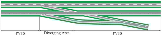 The capacity bottleneck of the expressway diverging area can be affected by traffic characteristics, geometric design, and management strategy, while current research has focused on traffic control measures and demand management [14,15]. Some researchers believe that congestion alleviation can be achieved through traffic demand reduction and emphasize the gains from expressway charges and traffic restrictions. However, this approach fails to deal with the problem in the long term, and the travel restriction can be a nuisance for travel, as suggested by other articles [16,17,18,19]. Optimization of traffic management strategies such as ramp metering, sign optimization, and dynamic guided detours can also positively contribute to congestion alleviation; these parameters were extensively investigated in research [20,21,22]. Nevertheless, the optimization of road geometry design can provide the most direct and effective approach to achieving a fundamental solution; thus, this paper presents an upgraded geometric design and traffic organization strategy for a multi-lane expressway diverging area with the aim of reducing lane changes. In addition, the authors also address the disturbance to exiting vehicles caused by the barrier effect produced by trucks, which can be effectively tackled with the PVTS strategy, which helps improve a transport environment and provide an essential idea for this paper [23,24].