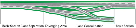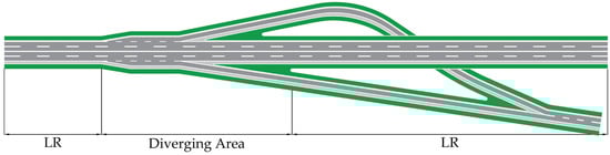 As the exclusively controlled hub connecting the expressway to the surrounding road network, the interchange plays a vital role in transferring traffic flow. However, the exit diverging area on interchange has also been regarded as a bottleneck section that produces local delay and congestion, ultimately leading to decreased transport efficiency along the entire road mainline [1]. The bottleneck can be attributed to drivers’ difficulty in identifying exit locations and changing lanes consecutively within specific deadlines, exacerbating their workload, increasing error probability, and disrupting the smooth traffic flow on the mainline due to frequent consecutive lane changes [2,3,4,5]. Furthermore, this issue has been associated with a higher probability of accidents in the diverging area, as stated in various literatures [6,7,8]. This problem may be particularly prominent on multi-lane expressways, where diverging traffic requires longer lane change maneuvers. Heavy congestion can also exacerbate pollutant emissions, despite upgraded vehicle emission standards, with current studies commonly associating them [9,10]. Mechanistic explanations for this phenomenon have pointed to a significant increase in fuel consumption and emissions during the transition from free flow to congestion [11]. Obviously, this issue contradicts the sustainable development concept that has attracted public attention in recent years, leading scholars to focus on research on improvement measures [12,13].