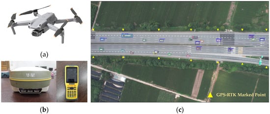 Equipment for data collection and processing interfaces for and extraction. (a) DJI Air 2S UAV will capture aerial footage of the designated section from a height of 150–250 m. (b) The GPS-RTK receiver with a handbook is used to mark feature points in the video that identify road coordinates. (c) Vehicle trajectories are extracted by utilizing vehicles within blocks as screen and track targets for the YOLOv3, which captures the motion trajectory data. In addition, yellow triangles denote marked points that GPS-RTK measured.