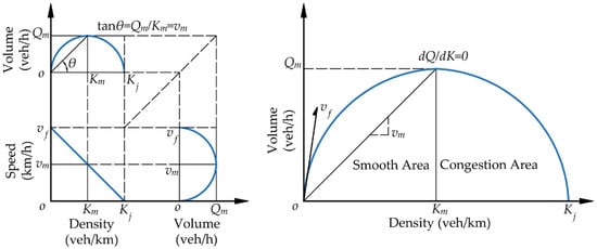 Moreover, the Greenshields model will also serve as an additional benchmark to verify the simulation accuracy, which depicts the objective connection among the three traffic parameters in real traffic. As shown in Figure 6, volume increases towards its maximum capacity at a density equivalent to half of the jam density. Subsequently, volume experiences a decrease, eventually leading to the traffic flow being divided into smooth and congested areas.