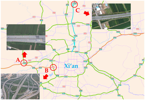Geographical location and actual view of the investigated section and interchanges. A and B denote Interchange Xiwu and Interchange Epanggong on G30, respectively, while C denotes Interchange Xinqu on G6522. In addition, G30 and G6522 are traced in orange and blue, respectively.
