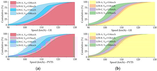 This phenomenon can be explained by the fact that certain slow-moving vehicles, or “turtle cars”, occupying the mixed lane have shifted to the passenger vehicle lane, producing a negative impact. Although this impact is negligible at low LOS, as all vehicle speeds will be suppressed, it is evident in the figure that the number of “turtle cars” on PVTS truck lanes is fewer than that on LR mixed lanes. After excluding this effect, the benefits of PTVS in mitigating the barrier effects produced by trucks can still be interpreted. The same explanation still applies to the clarification for Figure 10.