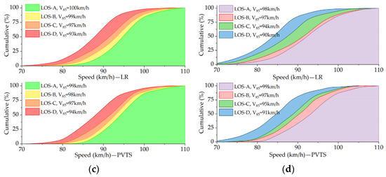 Cumulative distribution curve for vehicle speed at LOS-A to LOS-D with LR and PVTS management strategies, respectively. V85 is also labeled in the legend. (a–d) denote the first to the fourth lane, left to right, respectively.
