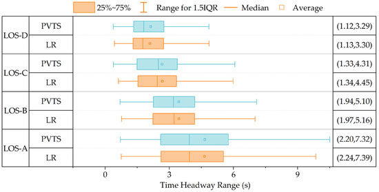 Time headway distribution for LOS-A to LOS-D on the LR and PVTS sections, respectively, with the range from 15% to 85% interval in the rightmost column.