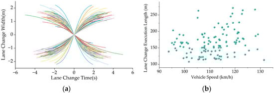 Investigate vehicle lane change execution characteristics. (a) Each line denotes a vehicle’s lane change trajectory. X denotes the time series of lane changing with 0 marked as the moment when the vehicle centerline coincides with the boundary of the fast and curb lane, and Y denotes the width of lane changing with 0 marked as the same means. (b) A moderately strong positive correlation has been shown between length and speed, with a Kendall coefficient of 0.326. Each point denotes the data for a lane change.