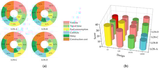 From the perspective of the results, according to Figure 16, the results consistently demonstrate that CI outperforms other designs at LOS-A. This can be attributed to the fact that, in smooth traffic, vehicles remain free to change lanes without excessive restrictions, resulting in an acceptable level of extra conflicts and delays associated with consecutive lane changes in diverging areas. Thus, the benefits cannot be matched by the massive renovation required in this condition. Similarly, the same reasoning applies to LSI and PVTS, although PVTS performs best in traffic indicators at LOS-A. LRER deservedly performs the worst due to its unsatisfactory transport performance, as well as maintaining this tendency up to LOS-B, and the explanation has already been discussed in Section 3.2.