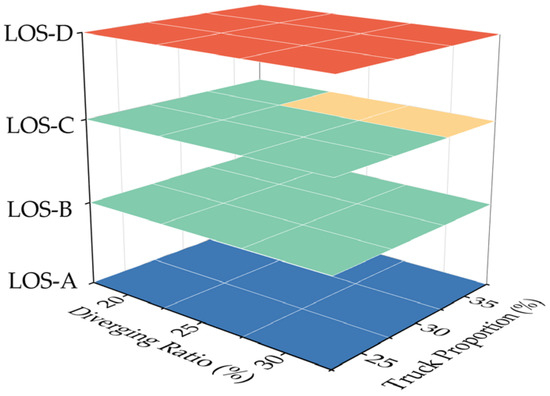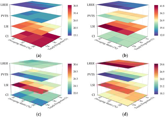 Similarly, excess trucks will also exacerbate the barrier effect and impede smooth diversions, but PVTS responds to the opposite. Too few trucks contribute to oversaturation in the passenger vehicle lane and are accentuated at low LOS. Conversely, products will transfer to the truck lane, requiring an optimal proportion of approximately 30–35% to match the optimal effect of PVTS, as demonstrated in Figure 16 and the Appendix A.