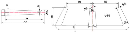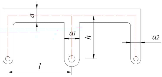 where β = 2(a/a1)3 + (a/a2)3, δy is the yield displacement of the steel damper, h is the height of the middle limb, l is the length of the cross beam on one side, a, a1, and a2 are the widths of the cross beam, middle limb, and side limb, respectively, εy is the steel’s yield strain, and εmax is the maximum strain on the steel damper’s surface, as shown Figure 6.