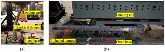 Experimental loading process. (a) Cylindrical steel damper (b) E-shaped steel damper.
