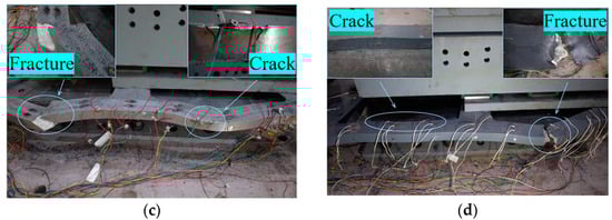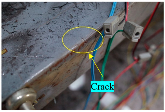According to the yield state of steel and the performance state of the damper in operation, combined with the observed conditions in the experiment and the experimental results, the steel damper is divided into five performance levels, where their corresponding CIS values are shown in Table 3. The cumulative inelastic strain at the onset of yielding is defined as CIS1. In contrast, the cumulative inelastic strain after the steel damper completes the loading steps (Figure 8) specified in the Chinese standard [22] is defined as CIS2. The cumulative inelastic strain corresponding to minor cracks in the steel damper is defined as CIS3, as shown in Figure 9. The cumulative inelastic strain corresponding to severe cracks or even fracture in the steel damper is defined as CIS4, as shown in Figure 3.