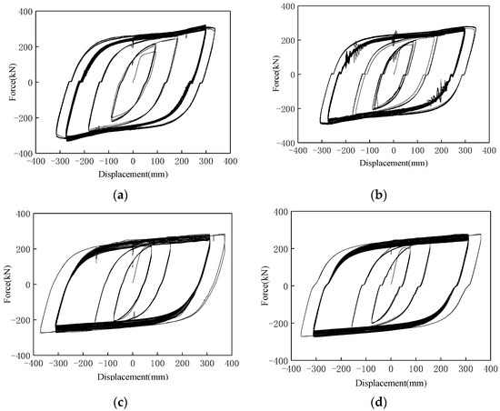 The failed steel dampers are shown in Figure 4. The cylindrical #1 specimen failed after 54 cycles under the designed displacement, while the cylindrical #2 specimen failed after 41 cycles under a higher loading rate. The failure locations and modes were the same. The E-shaped #1 specimen failed after 40 cycles under the designed displacement, while the E-shaped #2 specimen failed after 33 cycles under a higher loading rate, with both failures occurring in the middle of the cross beam. Figure 5 shows the force-displacement curves for the four specimens with full hysteresis curves, which can withstand multiple cycles of reciprocating loads under the designed displacement, meeting the earthquake requirements. The experimental results indicate that the faster the loading rate, the more likely the specimen is to experience fatigue failure.
