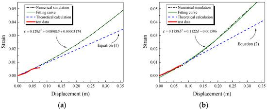 The strain-displacement curves of the cylindrical and E-shaped steel dampers obtained through numerical modeling in Figure 6 were fitted. Equations (3) and (4) establish the relationship between the two.