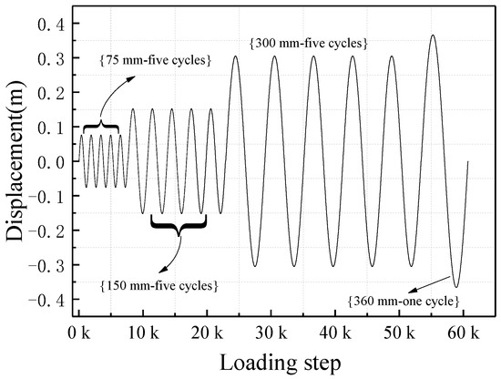 The loading configurations for the cylindrical steel damper and E-shaped steel damper are illustrated in Figure 3. The loading rule follows the reference of Chinese standards, which specifies that analyzing the mechanical behavior of dampers requires loading at four displacement levels, which are 0.25Δd, 0.5Δd, 1Δd, and 1.2Δd. The corresponding number of cycles for each displacement level is 5, 5, 10, and 1 cycle, respectively. And then, under the displacement of 1Δd, the dampers are cyclically loaded until failure to analyze their fatigue performance. The average speed of all loading steps should not be less than 2 mm/s. For the E-shaped specimens, loading is performed according to the requirements of the standard. Considering the rapid deformation rate of steel dampers under an earthquake, the loading speed is increased in the 5th loading step. The difference between Specimen #1 and Specimen #2 lies in the loading rate of the 5th loading step, aiming to analyze the effect of the loading rate on fatigue performance. As for the cylindrical specimens, there is a slight deviation in the loading displacement compared to the standard, but it generally achieves the objective of analyzing the fatigue performance of the dampers. After increasing the loading rate in the 4th loading step, it is found that the loading device has the remaining capacity, so the loading speed is further increased in the 5th loading step. The loading scheme is presented in Table 1.