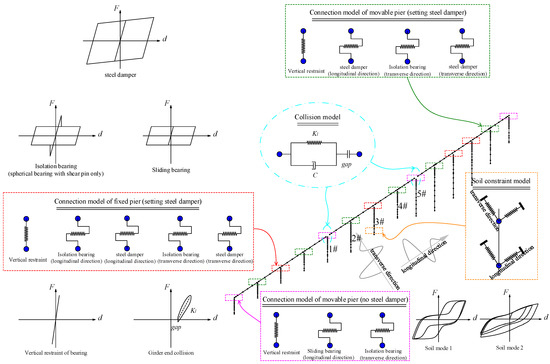 A continuous girder bridge of seismic isolation design with a span of 4 × 50 m was taken as an example. In order to consider the contribution of the adjacent bridge stiffness and mass to the transition pier of the target bridge and realistically simulate the possible collision behavior, the adjacent bridge structure was established in the model at the same time. The analysis software adopts OpenSeeS 3.2.0, with beam elements used for the girders, bridge piers, and foundation. The MinMax material model was utilized to simulate the failure behavior of the fuse pins in the seismic isolation bearings. The mechanical behavior of the frictional component of the bearings and the steel dampers is modeled using a bilinear model. A parallel combination of a spring element with a contact stiffness of kl and a damping element with a damping coefficient of C is adopted to simulate the collision effect at the girder ends. The centralized parameter model proposed by Boulanger [24] is employed to model the pile-soil interaction. For the four-span structure under study, the bridge piers are numbered from left to right as #1, #2, #3, #4, and #5. For the longitudinal direction of the bridge, an isolation bearing with fuse pins and a steel damper device is installed on the pier top of #3, and steel damper devices are installed on the #2 pier and #4 pier. For the transverse direction of the bridge, seismic isolation bearings with fuse pins and steel damper devices are installed on the #2 pier, #3 pier, and #4 pier. Figure 10 describes the numerical model of the overall bridge example.