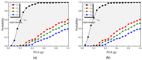 This paper adopts a frequency-based statistical method based on incremental dynamic analysis to analyze the exceedance of specified functional states. Unlike the traditional methods, this method does not require any approximation assumptions or fitting of data points. In contrast, this method counts the number of times the specified damage state is reached or exceeded to obtain the failure probability at the specified functional state, as shown in Equation (8).