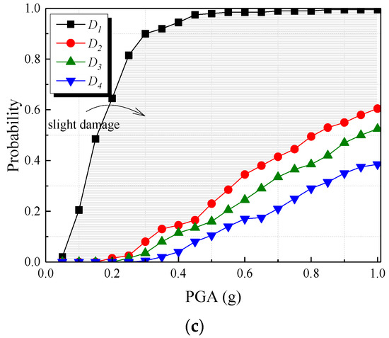 Figure 13 shows the fragility curves of the steel dampers installed in the transverse direction of the bridge, which is similar to the situation in the longitudinal direction. Steel dampers installed along the transverse direction of the bridge also exhibit a high seismic performance reserve in the slight damage state. Taking the steel damper on the #2 pier as an example, at PGA = 0.15 g, the probability of moderate or higher damage (D ≥ 0.206) occurring in the steel damper is zero. Even under higher seismic actions (PGA = 0.4 g), the probability of moderate or higher damage occurring is only 13.5%. The probability of experiencing serious or higher damage is 11.5%, and the probability of complete destruction is 6%. At PGA = 0.85, moderate or higher damage begins to dominate, with a probability of 51.5%, a probability of severe or higher damage of 43.5%, and a probability of complete destruction of 33%. In most seismic scenarios, the fatigue damage of the steel dampers is not a prominent issue.
