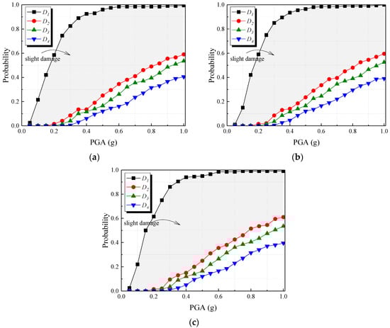 Figure 12 shows the fragility curves of the steel dampers installed in the longitudinal direction of the bridge, where the slight damage state is the primary performance state under the design earthquake. Taking the steel damper on the #2 pier as an example, at PGA = 0.15 g, the probability of moderate or higher damage (D ≥ 0.206) occurring in the steel damper is zero. Even under higher seismic actions (PGA = 0.4 g), the probability of moderate or higher damage occurring is only 14.5%. The probability of experiencing serious or higher damage is 11.5%, and the probability of complete destruction is 4%. At PGA = 0.85, moderate or higher damage begins to dominate, with a probability of 52.5%, a probability of severe or higher damage of 41%, and a probability of complete destruction of 31%.