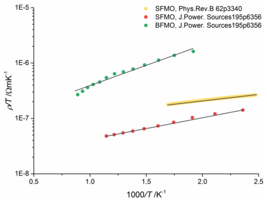 A more detailed consideration of the reported resistivity behavior of Sr2FeMoO6-δ and Ba2FeMoO6-δ above TC [50,51] reveals a convincing fit to the adiabatic small polaron hopping model [53] (Figure 2). In the small polaron model, electrical conduction of perovskites at higher temperatures, i.e., above a certain transition temperature, occurs as a result of small polarons moving through the lattice by thermally activated jumps between neighboring sites. The transition temperature from small polaron motion in a conduction band to small polaron hopping was estimated to be in the order of θD/2 (with θD the Debye temperature), which amounts to 338 K for SFMO [54]. The adiabatic small polaron hopping model yields a resistivity of [53]