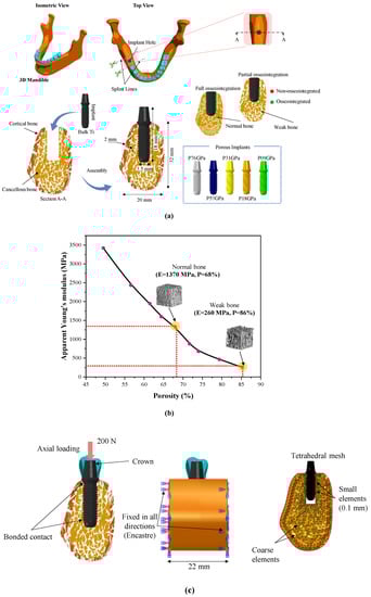 Bone-implant models; (a) CAD modeling of bone and dental implants, (b) the correlation between cancellous bone apparent Young’s modulus and porosity, and (c) load, boundary conditions, and mesh.