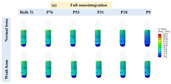 Figure 2 displays the distribution of von Mises stress (in MPa) in the implants that have contact with cancellous bone and the highest values of the stresses acting on the implants are reported in Table 2. It was observed that the cervical area next to the cortical bone was found to have the highest concentration of stresses. Additionally, it was noticed that the weak bone generated more stress in the implants than the normal bone. Furthermore, it was observed that the maximum stresses obtained for the implants of partial osseointegration were lower than those of full osseointegration. The maximum stresses ranging between 13.07 MPa and 19.90 MPa, were observed in the weak bone with full osseointegration case. The minimum stresses were observed in normal bone with partial osseointegration, ranging from 10 MPa to 15.90 MPa. Moreover, the stress in bulk Ti implants was higher than in porous implants. However, the magnitudes of the highest stresses (Table 2 and Figure 2) were below the yield stress in all cases (P76 with a yield stress of 760 MPa, P53 with 528 MPa, P31 with 305 MPa, P18 with 176 MPa, and P9 with 88 MPa) as reported in []). It was also observed that the stress distribution in the axial direction of implants was reduced as the porosity of implants was increased in the case of normal bone. However, in weak bone, the stresses remained similar.