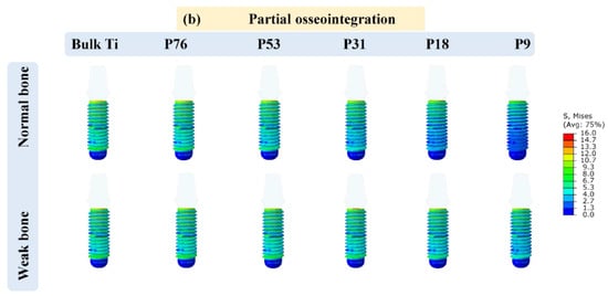 Figure 2 displays the distribution of von Mises stress (in MPa) in the implants that have contact with cancellous bone and the highest values of the stresses acting on the implants are reported in Table 2. It was observed that the cervical area next to the cortical bone was found to have the highest concentration of stresses. Additionally, it was noticed that the weak bone generated more stress in the implants than the normal bone. Furthermore, it was observed that the maximum stresses obtained for the implants of partial osseointegration were lower than those of full osseointegration. The maximum stresses ranging between 13.07 MPa and 19.90 MPa, were observed in the weak bone with full osseointegration case. The minimum stresses were observed in normal bone with partial osseointegration, ranging from 10 MPa to 15.90 MPa. Moreover, the stress in bulk Ti implants was higher than in porous implants. However, the magnitudes of the highest stresses (Table 2 and Figure 2) were below the yield stress in all cases (P76 with a yield stress of 760 MPa, P53 with 528 MPa, P31 with 305 MPa, P18 with 176 MPa, and P9 with 88 MPa) as reported in []). It was also observed that the stress distribution in the axial direction of implants was reduced as the porosity of implants was increased in the case of normal bone. However, in weak bone, the stresses remained similar.