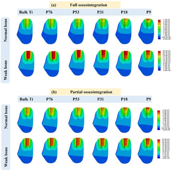 Comparison of displacements in normal and weak bone; (a) full osseointegration and (b) partial osseointegration.
