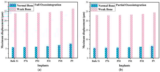 The displacements in cancellous bone in all cases were calculated when the load of 200 N was applied at the top of the crown. The vertical micro-displacement in the case of full and partial osseointegration for normal and weak bones is depicted in Figure 3, and the maximum values are shown in Figure 4. The maximum displacement was observed in weak bone for the P76 implant, with a value of 26.48 µm in the case of full osseointegration and 24.51 µm in the case of partial osseointegration. The minimum displacement reached a value of 5.67 µm in normal bone for bulk Ti implant in the case of full osseointegration, and 5.38 µm in the case of partial osseointegration. Therefore, the low stiffness of the implant (porous implants) produces more displacement in cancellous bone than the Bulk Ti implant, which has higher stiffness. Moreover, weak bone is more susceptible to higher displacement than normal bone.