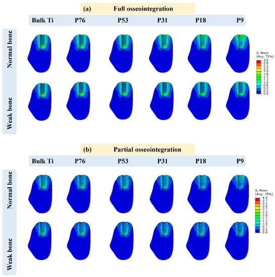 Figure 2 displays the distribution of von Mises stress (in MPa) in the implants that have contact with cancellous bone and the highest values of the stresses acting on the implants are reported in Table 2. It was observed that the cervical area next to the cortical bone was found to have the highest concentration of stresses. Additionally, it was noticed that the weak bone generated more stress in the implants than the normal bone. Furthermore, it was observed that the maximum stresses obtained for the implants of partial osseointegration were lower than those of full osseointegration. The maximum stresses ranging between 13.07 MPa and 19.90 MPa, were observed in the weak bone with full osseointegration case. The minimum stresses were observed in normal bone with partial osseointegration, ranging from 10 MPa to 15.90 MPa. Moreover, the stress in bulk Ti implants was higher than in porous implants. However, the magnitudes of the highest stresses (Table 2 and Figure 2) were below the yield stress in all cases (P76 with a yield stress of 760 MPa, P53 with 528 MPa, P31 with 305 MPa, P18 with 176 MPa, and P9 with 88 MPa) as reported in []). It was also observed that the stress distribution in the axial direction of implants was reduced as the porosity of implants was increased in the case of normal bone. However, in weak bone, the stresses remained similar.