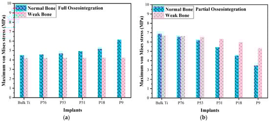 The stress distribution in cancellous bone is shown in Figure 5. It could be observed that the mechanical stresses are transmitted to the surrounding bone closest to the dental implant and decrease towards the other outer regions. It was also observed that the maximum stress was generated at the apical region in normal bone with 4.47 MPa with the Bulk Ti implant and 6.12 MPa with the P9 implant. In weak bone, when bulk Ti and P9 implants were used then the stresses were 4.18 MPa and 4.24 MPa, respectively, and that is in the case of full osseointegration, as shown in Figure 6a. In the case of partial osseointegration, the maximum von Mises stress was observed in normal bone for bulk Ti and it decreases with decreasing the Young’s modulus of the implant, the same pattern follows for weak bone, as shown in Figure 6b. The compressive strength of normal bone is typically around 15 MPa, whereas for individuals with osteoporosis, the compressive strength decreases to around 6 MPa []. In the case of full osseointegration, where the implant is fully bonded to the surrounding bone tissue, the stresses exerted on the cancellous bone were typically below the compressive strength for both normal and weak bones. However, in the cases of partial osseointegration, where the implant is not fully integrated with the bone tissue, the stresses on the bone were higher, especially for weak bone with denser implants such as Bulk Ti, P76, P53, and P31. This increased stress can make the cancellous bone more prone to fracture.