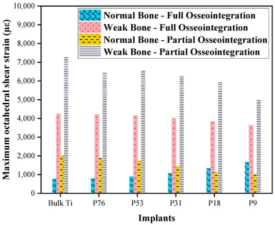 Figure 8 shows the maximum octahedral shear strain in cancellous bone. It can be observed that higher strain was in normal bone compared to weak bone in all cases. In the case of full osseointegration for normal bone, the minimum octahedral shear strain was observed in bulk Ti implants, compared to the porous Ti implants. However, for the weak bone, the octahedral shear strain decreased with increasing the porosity of the implant. In the case of partial osseointegration, the octahedral shear strains were higher compared to the full osseointegration. In all cases of weak bone (see Figure 8), where the octahedral shear strains were above 3000 µɛ, it is expected that bone damage may occur. Such high levels of strain put significant stress on the weakened bone, making it prone to damage according to the mechanostat in Figure 7. When considering full osseointegration with P76, P53, and P31 implants in normal bone, where the maximum octahedral shear strains ranged between 700 µɛ and 1500 µɛ, the bone experiences an adaptive strain state. This range of strain stimulates bone adaptation to the implant, enhancing stability and integration which does not change the mass or density of the bone. In the case of full osseointegration in normal bone with bulk Ti, P76, and P53 implants, where the strain was less than 1000 µɛ, the bone may experience some degree of atrophy. Strain levels within this range indicate that the mechanical stimulus provided by the implant is relatively low, which can result in bone resorption. However, in the case of partial osseointegration with the same set of implants of normal bone, where the strain ranged between 1500 and 3000 µɛ, the bone faces physiological overload.