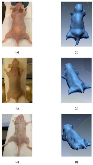 Before we injected the grafts, the mice were scanned using a 3D Artec Eva camera (Artec 3D; Senningerberg, Luxembourg). Each mouse was placed in a standard position. During the scanning, the tail and neck were in the same axis, and the legs were maximally stretched. New scans were performed in the second week (T1) after fat tissue application when the majority of the edema and hematomas had disappeared. Scanning was repeated at 3 (T2) and 6 (T3) months after the fat injections. All scans were performed with the mice under general anesthesia in the described position.