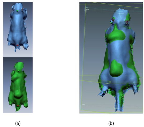Best fit on scan without fat transplant: (a) points used for best fit, (b) mouse model after best-fit procedure.