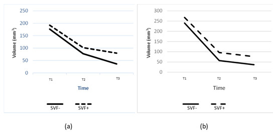 (a) Volume changes of fat transplant at T1, T2, and T3 above left scapula region in control group SVF- and SVF+. (b) Volume changes of fat transplant at T1, T2, and T3 above sacrum region in SVF- and SVF+; T0, 14 days after fat graft application; T2, 3 months after fat graft application; T3, 6 months after fat graft application; SVF-, control group; SVF+, a group with added stromal vascular fraction.