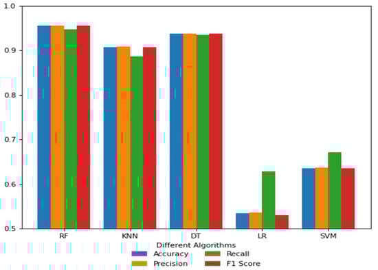 Finally, to evaluate the methodology, the same estimation parameters were generated and the Accuracy, Recall, Precision and F1-score values were compared for response policy decision point (PDP) performance during access control. As shown in Figure 6, logistic regression (LR) performs the worst, followed by support vector machines (SVM). Consequently, k-nearest neighbours (KNN), decision tree (DT) and random forest (RF) have comparable performance and values. In additional, Table 4 presents a performance before data processing (before the balancing data phase), and Table 5 examines the effectiveness of four primary metrics across various strategies and