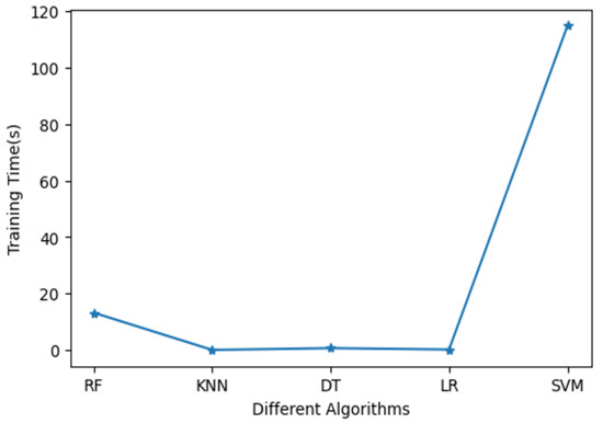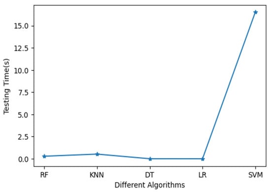 Time is a crucial aspect of access control security, as it enables timely and dynamic updates to the system’s access control policy, as well as prompt responses to access requests, therefore preventing the access control system from becoming a bottleneck. As a result, as depicted in Figure 7, the training time of the model was analysed along with the update time necessary for a policy decision point (PDP) to approve or deny an access request. The SVM algorithm required more training time than the other techniques, whereas the LR, KNN and DT algorithms required the same amount of time. Additionally, Figure 8 demonstrated that after applying data balancing techniques, the testing time results of various methods were analyzed, focusing on security access decision-making. The methods considered for analysis included random forest (RF), k-nearest neighbours (KNN), decision tree (DT), logistic regression (LR), and support vector machine (SVM). The analysis aimed to evaluate the performance of these methods in terms of their testing times after data balancing. The results indicated that RF, KNN, and DT exhibited testing times of zero seconds, while LR demonstrated a testing time of zero seconds as well. On the other hand, SVM exhibited a testing time exceeding 0.15 seconds. These findings provide valuable insights into each method’s computational efficiency and resource utilisation in the context of security access decision-making. Furthermore, they contribute to understanding the impact of data balancing on testing times and inform the selection of appropriate methods for security access decision-making tasks.