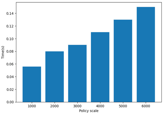 When compared to the conventional policy decision point for PDP based on machine learning in access control systems, the traditional way in which PDP is implemented in access control systems based on a logical process has a flexible and fast decision time as long as the feature attribute remains unchanged. However, it may be vulnerable to changes in the feature attribute, large policy scales and huge requests simultaneously, or unexpected access requests, all of which negatively impact the flexibility of access control systems. PDP-based ML has enhanced overall performance, flexibility and adaptability to meet access control needs for massive requests and complex policy volumes in real time. Figure 9 depicts the outcomes of an experiment analysing the flexibility of PDP based on ML in terms of policy size over time. The access control response per second to complex policies was used to evaluate flexibility. In the experiment, random requests for policy sizes ranging from 1000 to 6000 were sent and the time cost was approximately 0.15 s when the policy scale was 6000. It appears that the model responded positively to the size of the policy.