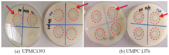 UPMC1393 and UPMC1376 showed a clearing zone as an indicator of the ability to solubilize phosphate (Figure 2). Vessey [41] found phosphate-solubilizing rhizobacteria to be one of the finest alternatives to inorganic phosphate fertilizers for improving plant productivity and development since phosphorus has been identified as one of the most critical nutrients for plant growth [69]. According to Modi and Patel [70], the best isolates as phosphate solubilizers were F372 (15 mg/L), which was associated with Saccharum officinarum, followed by ESB4 (14 mg/L). Bhardwaj et al. [71] obtained similar consistent phosphate solubilization findings in both agar and broth assays.