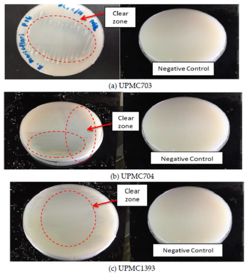 From the previous studies by Tan and Nazaruddin [43] and Mansor et al. [44], potential PGPRs were reactivated and revived for bio-chemical fertilizer production. These bacterial isolates were freeze-dried for long-term preservation. These eight PGPRs were isolated from the soils in the oil palm estates across Malaysia. They included UPMC1166, UPMC1168, UPMC1254, UPMC1389, UPMC1376, UPMC1393, UPMC703 and UPMC704. They were chosen in this study due to some functionality, potential of being PGPR, and being aerobic bacterial types [43,44]. All of these potential PGPRs can grow well under growth temperature conditions between 35 and 37 °C except for UPMC1389 (30–35 °C) [43,44]. They were collected from the culture collection site at Microbial Culture Collection Universiti Putra Malaysia (UPM). Certain biochemical tests were carried out to test the PGPR abilities.