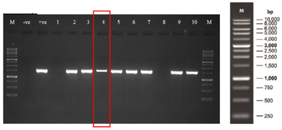 Electrophoresis gel image of PCR products. Marker: 1 kb marker. A 3 μL volume of the sample was loaded in each well. The target sequences were approximately 1500 bp. The percentage of gel was 1%. The forward primer was 5′ GAG TTT GAT CCT GC TCA G 3′ and the reverse primer was 5′ GTT ACC TTG TTA CGA CTT 3′ (BioSune Biotechnology Co., Ltd., China). Note1: Lane 1: empty; Lane 2: UPMC1166; Lane 3: UPMC1168; Lane 4: UPMC1254 (red box due to low density as compared to the other lanes); Lane 5: UPMC1389; Lane 6: UPMC1376; Lane 7: UPMC1393; Lane 8: Empty; Lane 9: UPMC703; Lane 10: UPMC704. Note2: Gel electrophoresis was conducted to separate amplified DNA fragments of different lengths. The length of DNA fragments affects the speed of DNA migration through the gel pores. The stability of biological molecules is achieved with the help of the buffer that functions as a conductor as well as controls the pH. The DNA ladder containing known fragment sizes was employed to assess the length of the amplified DNA sample [52]. All the isolates (UPMC1166, UPMC1168, UPMC1254, UPMC 1389, UPMC1376, UPMC1393, UPMC703 and UPMC704) were sent to Apical Scientific for bacteria identification and are shown in Table 5.