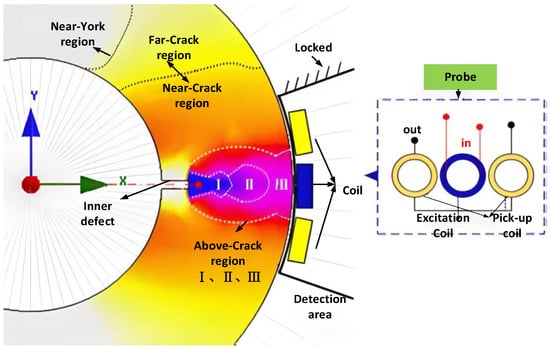 As shown in Figure 1, DC magnetization is used to actively excite MPP. The pipe is rotated along the magnetization direction, and a fixed position probe loaded through AC excitation induces the eddy current field on the external wall of the pipe. The regions of MPP cause changes in eddy current distribution, resulting in changes in the secondary magnetic field received by the probe. In order to maximize the detection sensitivity of the signal, the receiving coils and excitation coils are distributed along the circumference of the pipe directly above the defect. The probe has a differential structure, which is oriented close and perpendicular to the sample to be tested.