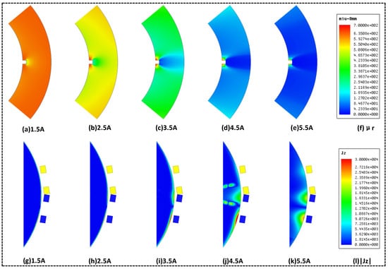 The simulation results of the φ50 mm × 8 mm steel pipe under different excitation currents are shown in Figure 6. Figure 6a–e show the cloud of the permeability distribution above the defect, and Figure 6g–k reflect the current density variation below the probe. When the magnetizing current is small, the MPP caused by the axial defect in the internal wall is weak, which has a small impact on the eddy current distribution. When the excitation current is strong enough, the MPP causes an effective eddy current perturbation in the surface layer of the steel pipe.