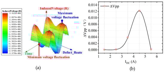 The maximum induced voltage of the probe is obtained every time the defect passes directly through the probe, as shown in Figure 7a. The changes in MPP under different magnetization currents while other parameter conditions remain unchanged are shown in Figure 7b. The voltage signal gradually increases with the enhancement of the excitation current at different excitation currents, and the voltage signal peaks around 4.5A and then gradually decreases with the enhancement of the excitation current. is the peak-to-valley value of the signal.